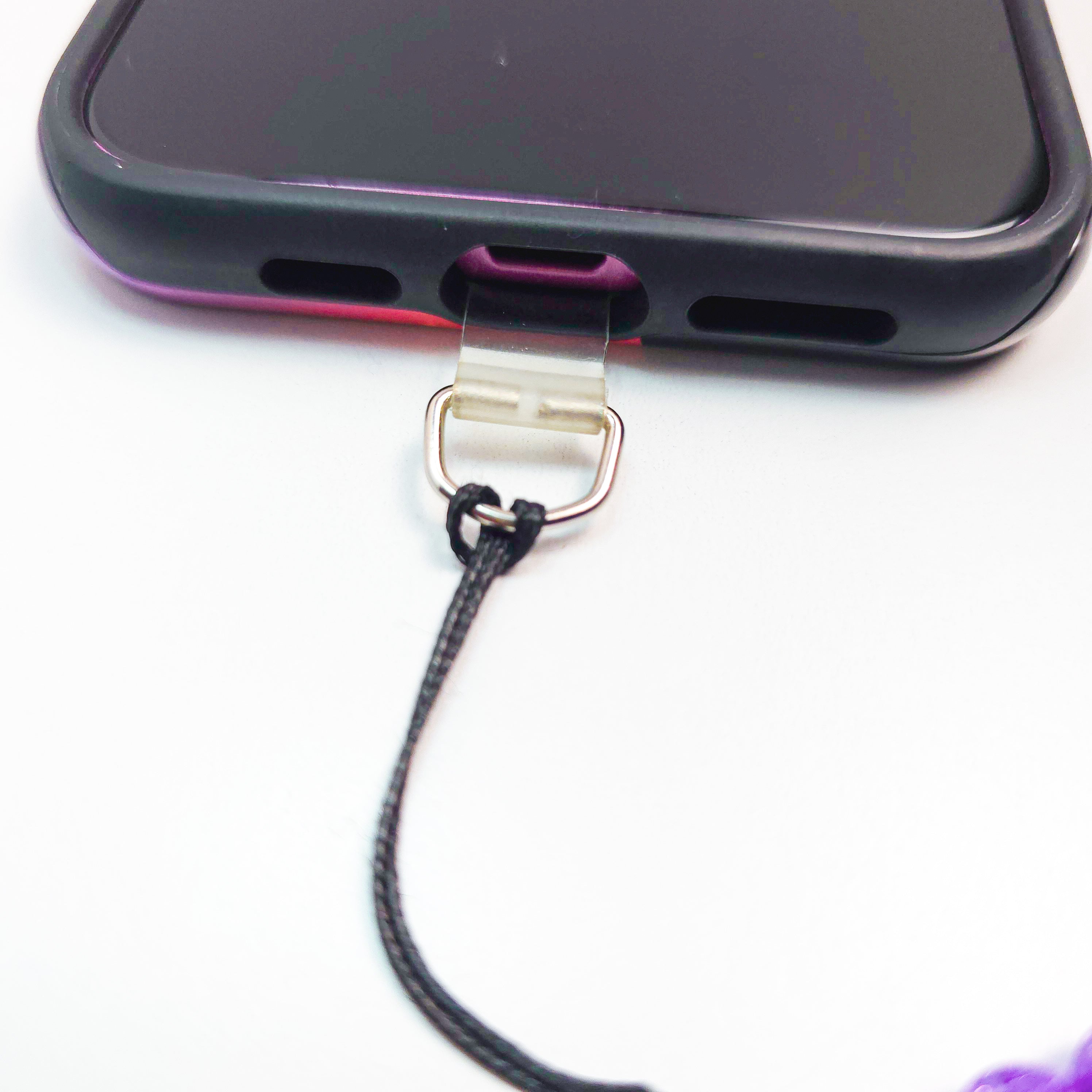 Place the flat tether tab inside your case, leaving the loop hanging out the charging port.
