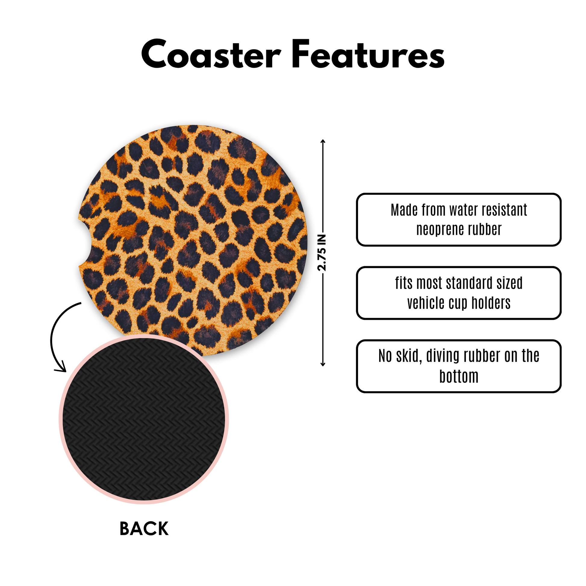 Turn your cupholders into a soft-life safari. Our Lux Leopard Cute Coasters bring high-fashion energy to your ride with a bold leopard print that looks luxe, not loud. The absorbent neoprene top catches drips from iced lattes and water bottles, while the anti-slip rubber backing keeps everything in place. A thumb notch makes quick lifts easy for cleanups. Universal 2.75" fit for most cars, SUVs, and trucks.