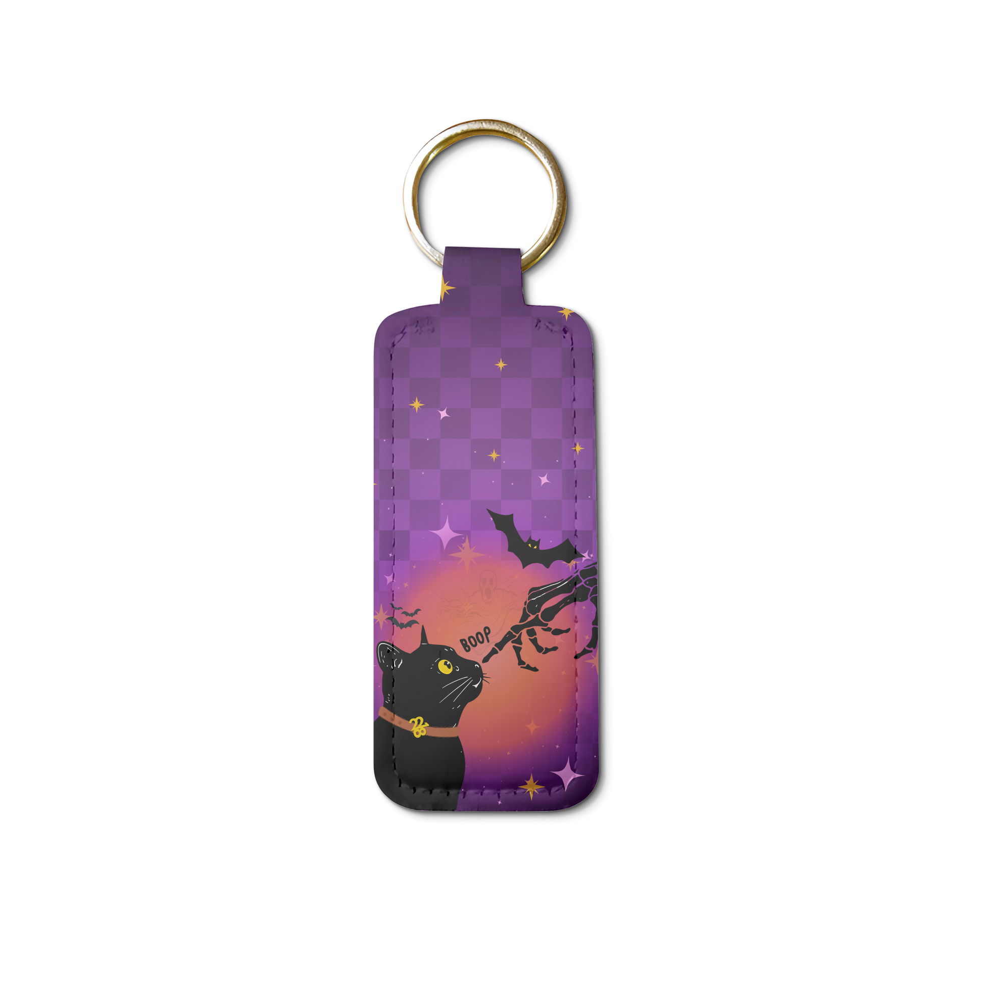 Spooky-cute, but make it practical. This Thrilla lip balm pouch serves black-cat energy with a sunset purple–orange gradient, tiny bats, and a playful “boop” moment—aka the perfect spooky szn bag charm for your mini tote or keys. Slide your fave lip balm or mini gloss in, clip it on, and go—no digging, no dry-lip jump scares.
