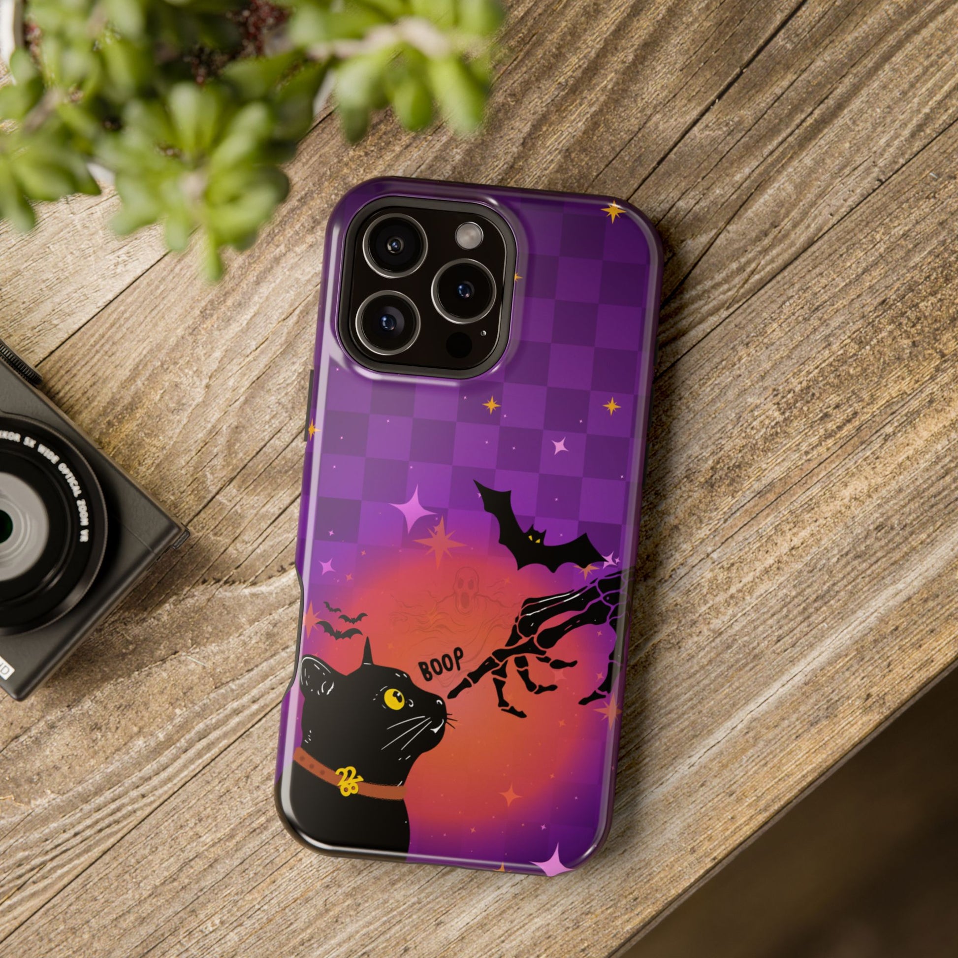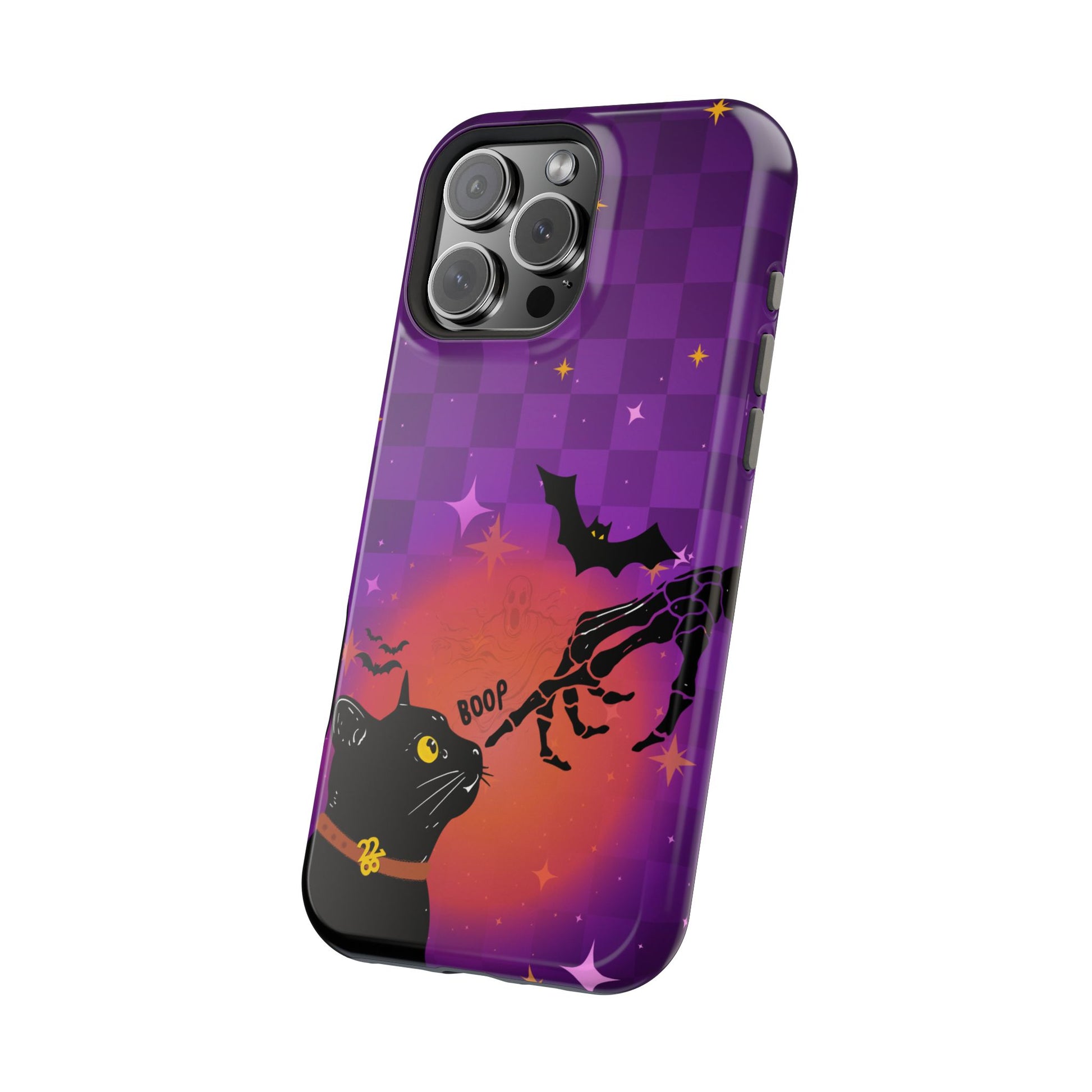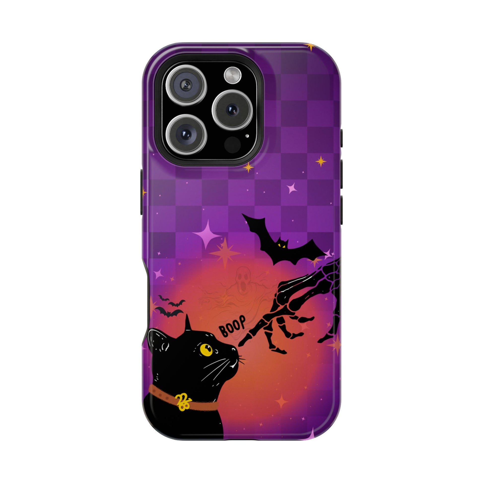 This one’s for the ghouls who ghost in style. “Thrilla” is your spooky season essential — a Halloween-themed phone case dripped in a bold purple checkerboard with bats, a ghostly glow, and a curious black cat getting “booped” by a bony finger. Whether you’re team trick or treat, this case is a whole vibe. Made for the girls who give witchy, witty, and just a lil' wicked.